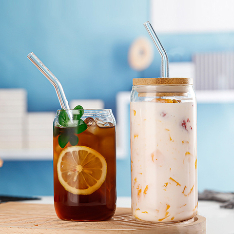Taza de vidrio de borosilicato con forma de lata de cerveza de 12oz, superventas en línea, sin tapa de bambú y pajita de vidrio